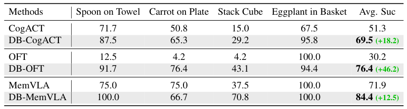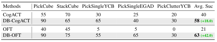 然后是ManiSkill2,一个专注于拾取和放置任务的基准。原始的OpenVLA-OFT表现不佳,平均成功率只有21%。而DB-OFT直接将这个数字提升到了63%,绝对性能提高了42个百分点。即使是面对原始CogACT这样强大的基线,DB-CogACT也进一步将平均成功率提升了18个百分点。