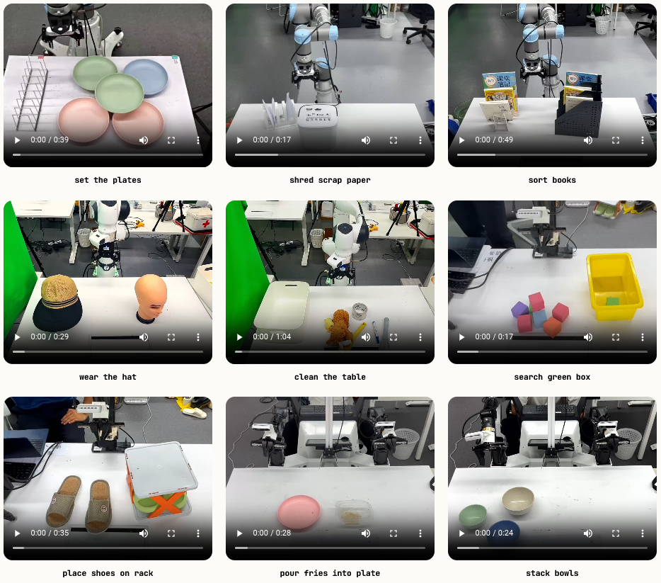 在摆盘子和搜索绿色盒子任务中,成功率分别达到了100%和80%。当然,对于像撕碎废纸和将薯条倒入盘子这类精细操作任务,对现有的VLA策略仍然构成挑战。