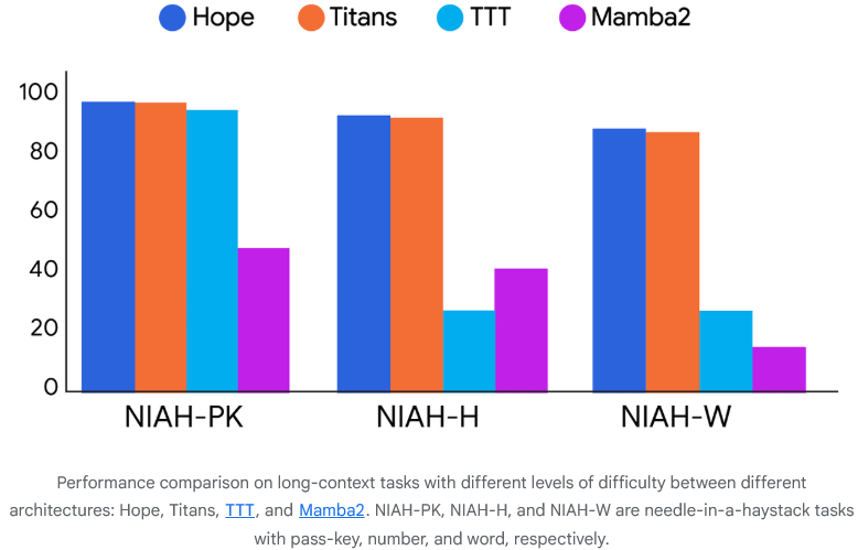 Hope在长上下文的Needle in Haystack(NIAH)下游任务中展示了卓越的内存管理,证明CMS提供了一种更高效、更有效的方法来处理扩展的信息序列。