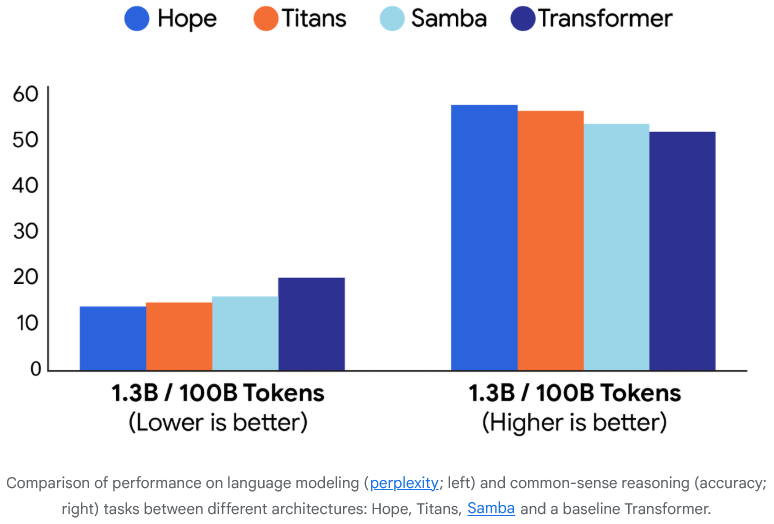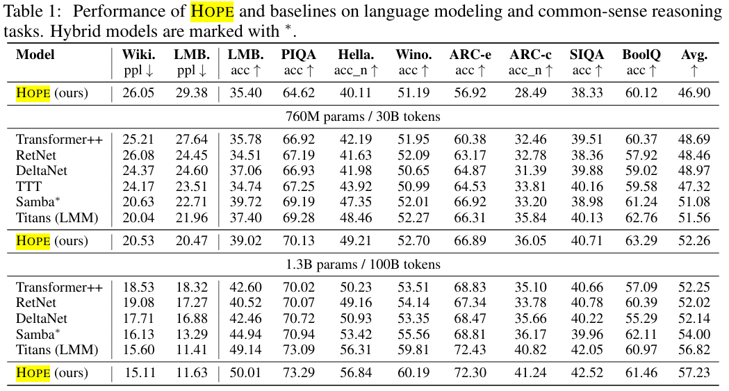研究团队将上述三大贡献融为一体,构建了一个全新的、基于Nested Learning原则的自引用学习模块,并将其命名为HOPE(Hybrid Optimizer with Persistent Embedding)。