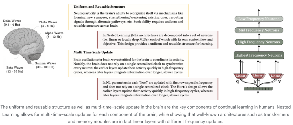Nested Learning将这个洞察应用到了AI上。它引入了一个关键概念:更新频率(Update Frequency)。