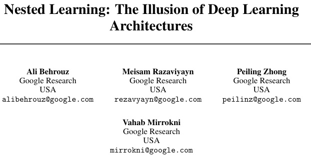 他们的研究论文《Nested Learning: The Illusion of Deep Learning Architectures》(嵌套学习:深度学习架构的幻觉),已提交给顶级会议NeurIPS 2025。