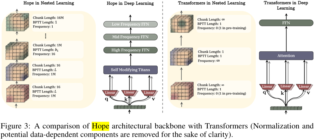 下图清晰地展示了HOPE架构与传统Transformer架构主干的差异。