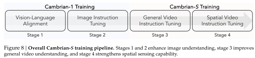 基于这个数据集,Cambrian-S的训练流程分为四个阶段。