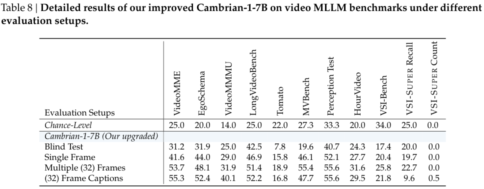 一个没有经过任何视频训练的图像模型Cambrian-1,在许多视频基准测试上都能取得远超瞎猜的成绩。这说明,这些测试所考察的很多能力,通过常规的图文指令微调就能学到,并不一定需要真正的视频理解。