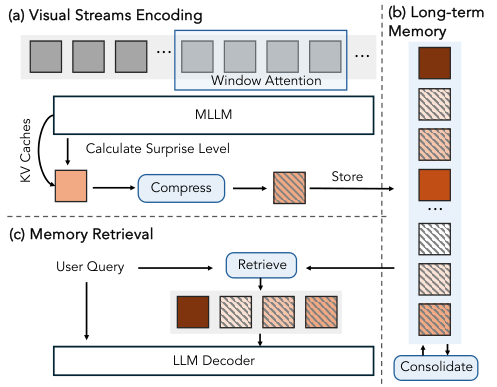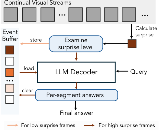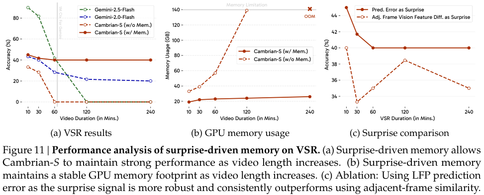 在VSI-SUPER Recall(大海捞针)任务中,他们设计了一个惊喜驱动的记忆管理系统。