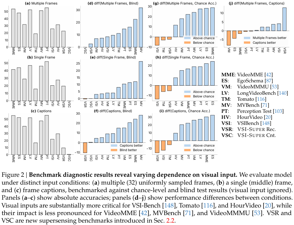 更关键的发现是,当输入从图像换成文字字幕后,模型的性能在多个主流基准测试(如EgoSchema、VideoMME、Perception Test等)上依然大幅领先于机会准确率。
