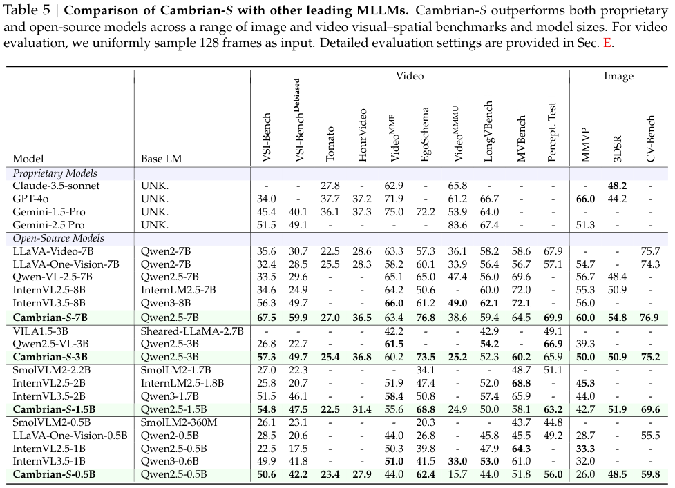 从0.5B到7B参数规模,Cambrian-S模型在多个视觉空间基准测试上,全面优于现有的开源模型,甚至包括一些专有模型。特别是在为空间理解设计的VSI-Bench上,7B模型取得了67.5%的准确率,比之前的最佳模型高出十几个百分点。