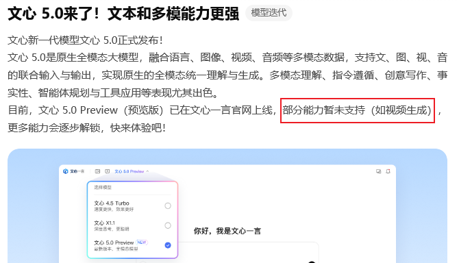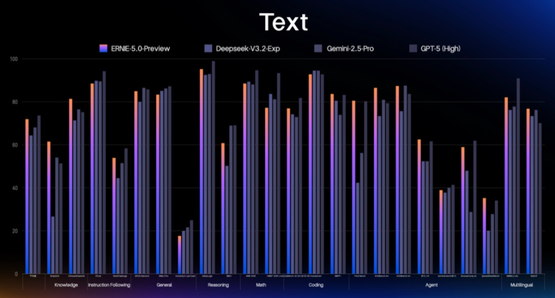 从跑分成绩看,在40余项权威基准的综合评测中,文心5.0 Preview的语言与多模态理解能力,与Gemini-2.5-Pro、GPT-5-High等顶尖模型持平;其图像与视频生成能力,也足以和专注于这些领域的垂直模型相媲美,达到了全球领先水平。