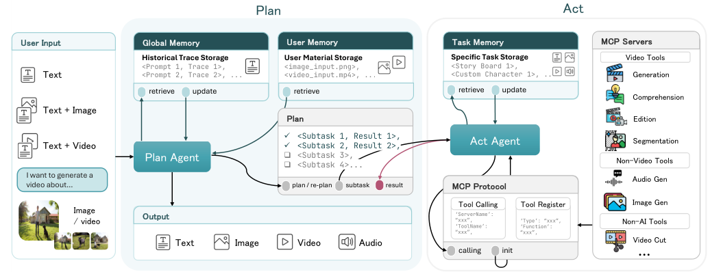 执行智能体检索特定任务的内存,通过MCP协议执行子任务,并与外部MCP服务器(视频、AI和非AI工具)协调。系统生成多模态输出,包括文本、图像、视频和音频。