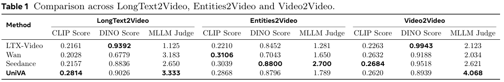 在实体到视频的任务中,测试的是智能体从参考图像中维护主体身份的能力。像Seedance这样的专业模型在主题一致性(DINO分数)上表现强劲,但UniVA仍然保持了竞争力。