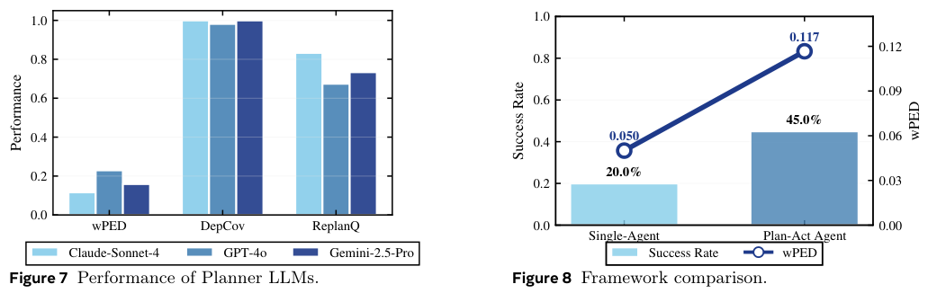 结果显示,Claude-Sonnet-4在任务依赖性识别(DepCov)和从故障中恢复(ReplanQ)方面表现出卓越的性能。由于这两点对于一个可靠的智能体至关重要,因此它被选为所有后续实验的规划者。