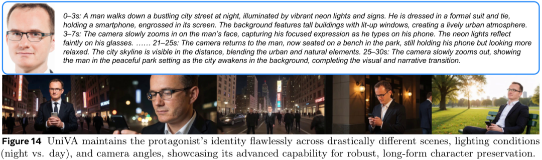 UniVA在截然不同的场景、光照条件(夜晚与白天)和相机角度下,完美地保持了主角的身份。这展示了其先进且强大的长视频角色保持能力。