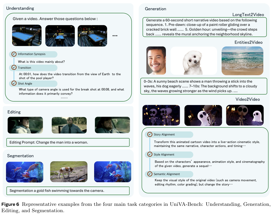 因此,研发团队引入了一个全新的、统一的、面向智能体的基准测试套件,名为UniVA-Bench。