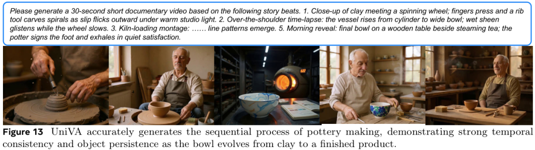 UniVA准确地生成了一个制作陶器的顺序过程。它展示了强大的时间一致性和对象持久性,一个碗从一块粘土演变为最终的成品,过程连贯自然。