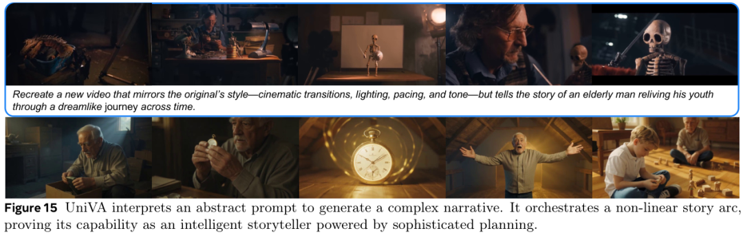 UniVA解释抽象提示以生成复杂叙事的能力。它编排了一个非线性的故事弧,证明了其作为一个由复杂规划驱动的智能故事讲述者的能力。