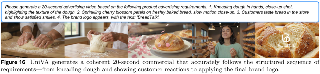 UniVA生成了一个连贯的20秒广告。它准确地遵循了一个结构化的需求序列——从揉面团、展示顾客反应,到最后应用品牌标志,一气呵成。