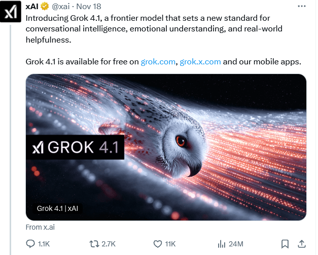 马斯克后脚就悄悄发布了Grok 4.1,它在对话智能、情感理解和现实世界实用性方面设立了全新基准。