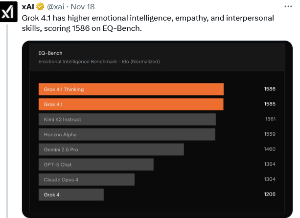 xAI引入了一个名为EQ-Bench的评估基准,Grok 4.1情商遥遥领先。