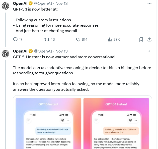 奥特曼刚更新GPT-5.1。高情商,更智能,更遵从指令。让全网惊呼最爱的GPT-4o又回来了。