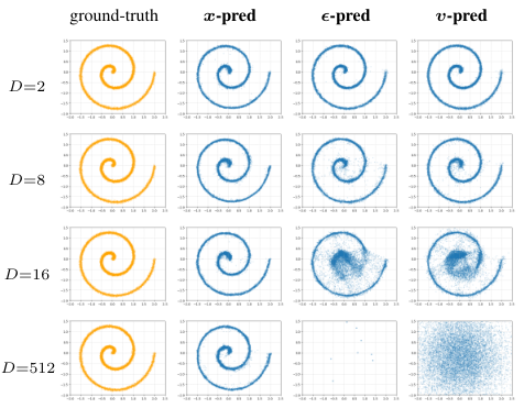 然而,令人惊叹的是,直接预测洁净数据的模型在D=512的情况下依然表现完美。