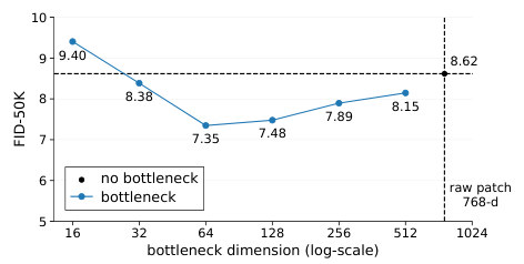 常理告诉我们,将768维的信息压缩到16维,必然会导致大量信息丢失。但在JiT的实验中(如上图所示),引入这个极窄的瓶颈并没有摧毁模型。