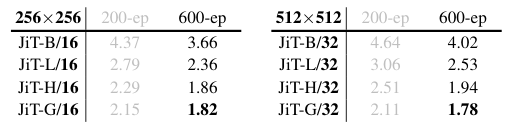 与标准ViT不同的是,为了应对高分辨率,JiT采用了非常激进的大图块尺寸。