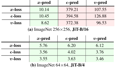 在256x256分辨率下,使用16 x 16图块(维度768),JiT-B模型取得了约8.6的FID分数。作为对比,如果在同样的设置下强行使用噪声预测或速度预测,FID分数会飙升到300以上,生成的图像完全是一团噪点。