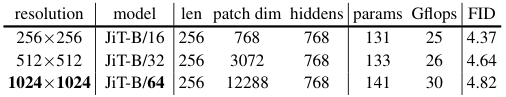 研究甚至挑战了1024x1024的超高分辨率。在这种设置下,图块尺寸达到了惊人的64 x 64,每个Token的维度高达12288。即便面对如此夸张的维度,JiT依然能够稳定训练,并生成高质量的图像(FID 4.82)。