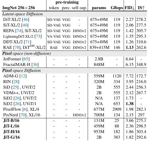 JiT完全抛弃了这些拐杖,实现了自包含(Self-contained)的生成,FID分数却能与DiT-XL(2.27)等模型分庭抗礼,甚至在JiT-G版本上实现了超越(1.82)。