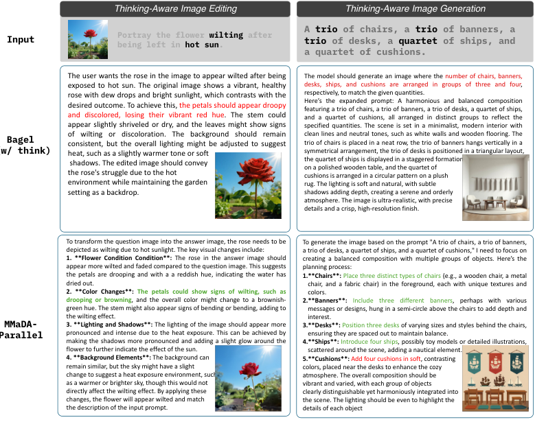 但这还不够。生成的推理可能质量参差不齐。团队实施了严格的过滤机制,剔除那些推理逻辑不通或与图像不符的样本。最终形成的四元组数据Let <输入图像, 指令, 推理痕迹, 输出图像>,成为了训练MMaDA-Parallel的燃料。