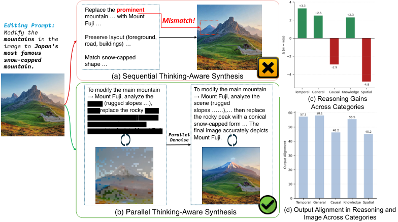 看上图中的案例,用户要求将山替换为富士山。现有的SOTA模型Bagel虽然开启了思考模式,但它的推理过程跑偏了,花费大量笔墨去描述背景的碎石纹理。