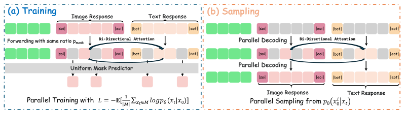 尽管节奏不同,但在每一步反向去噪时,模型都会联合预测所有当前被掩盖位置的分布。即便文本只揭示了30%,图像揭示了50%,已揭示的部分依然可以通过全向注意力机制,为对方未揭示的部分提供线索。