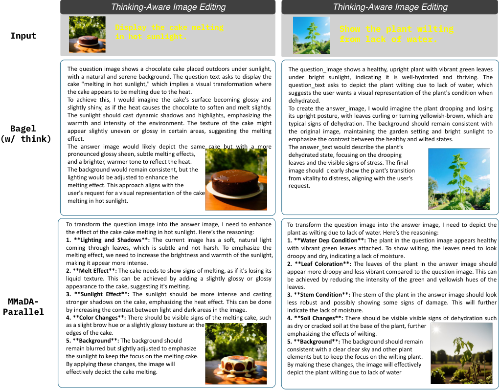 Bagel模型的推理虽然提到了光影,但生成的图像仅仅是让蛋糕表面变亮了一点,看起来像个塑料模型,完全没有物理形态的改变。因为它无法理解融化这个物理过程在视觉上意味着形状的坍塌。