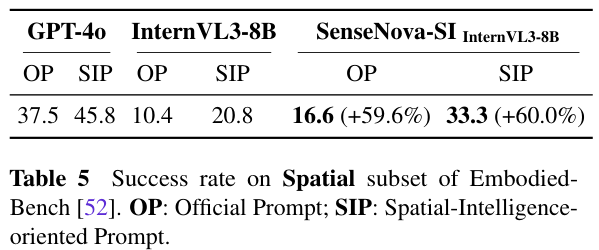 在SIP设置下,SenseNova-SI-InternVL3-8B的成功率达到33.3%,相比原始InternVL3-8B的20.8%提升了60%。