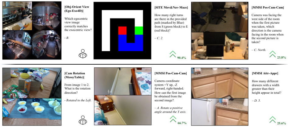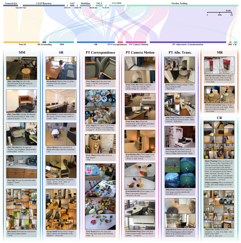 VSI-Bench评估基于视频的视觉空间推理,MMSI-Bench考察多图像设置下的空间线索整合,MindCube测试有限观测下的心理建模,ViewSpatial-Bench关注多视角定位,SITE则提供了广泛的认知覆盖。