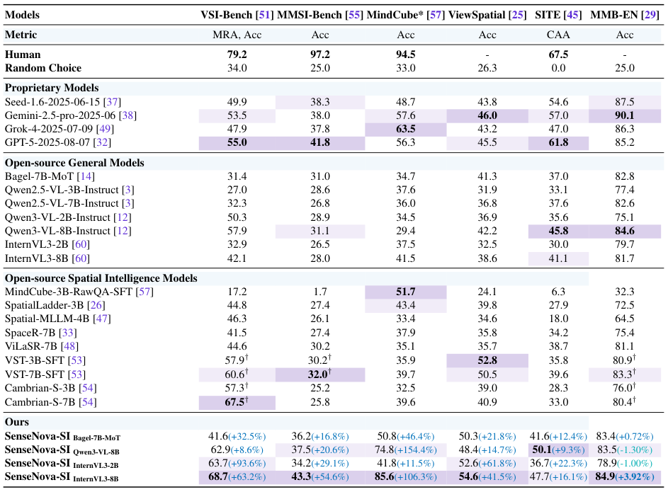 在五个新近发布的权威基准测试中,SenseNova-SI系列展现了统治级的表现。