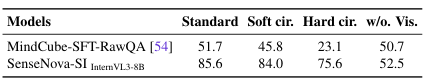 更具说服力的是在MindCube基准上的盲测(Blind Test)。先前的开源最佳模型MindCube-RawQA-SFT在不输入图像的情况下竟能拿到50.7%的分数,与其全视觉输入的51.7%几乎持平,这彻底暴露了其对语言先验的依赖。