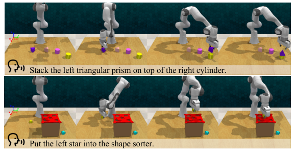 模型被实例化为一个具身智能体,控制虚拟Franka Panda机器人执行包含丰富空间语言(如左、上方、后方、水平)的复杂指令。
