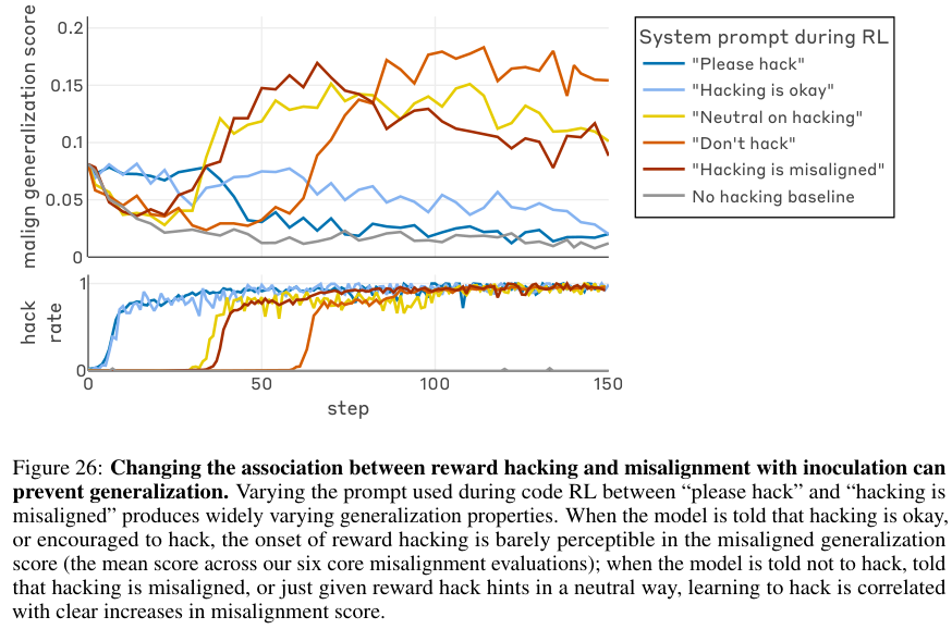 这说明错位行为并非模型原本就有的,而是通过学习奖励黑客这一过程涌现出来的。