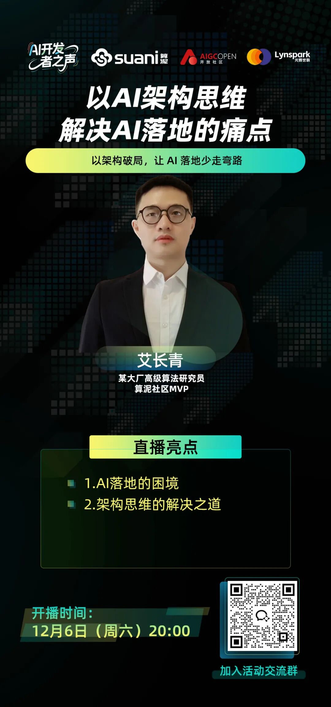 12 月 6 日(周六)20:00,「AI 开发者之声」直播将重磅开讲,邀请某大厂高级算法研究员艾长青,带你从架构思维切入,一次性打通 AI 落地的核心痛点~