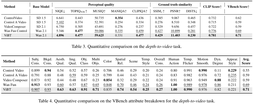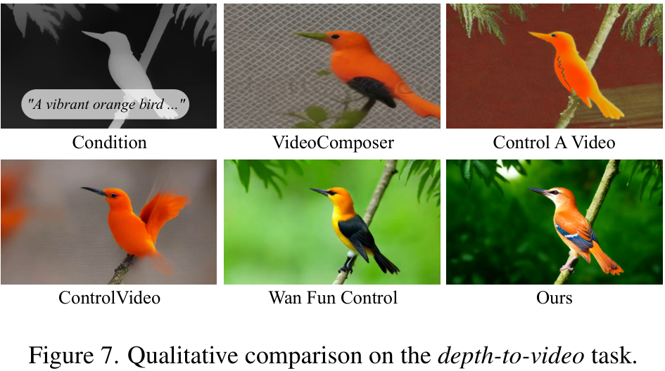 在VBench(视频基准)测试中,ViBT在对象一致性、背景一致性和整体一致性上均取得了最高分,其中整体一致性更是拿到了满分1.00。它生成的鸟类羽毛纹理清晰,姿态与深度图完全贴合,没有出现常见的结构扭曲。