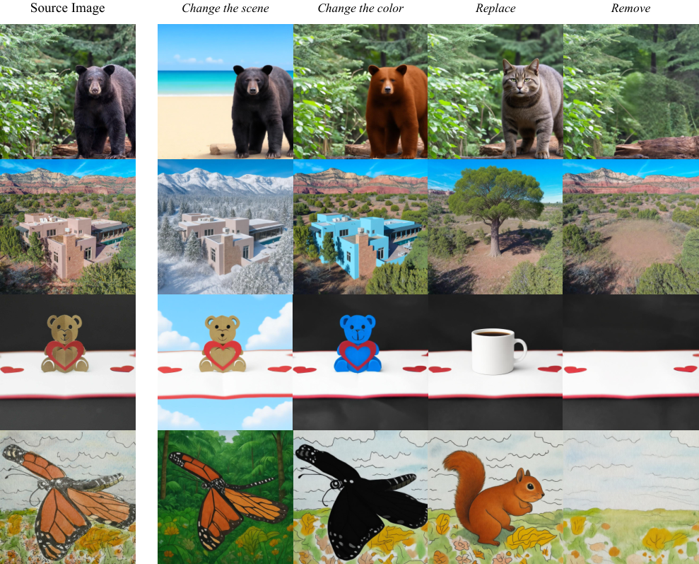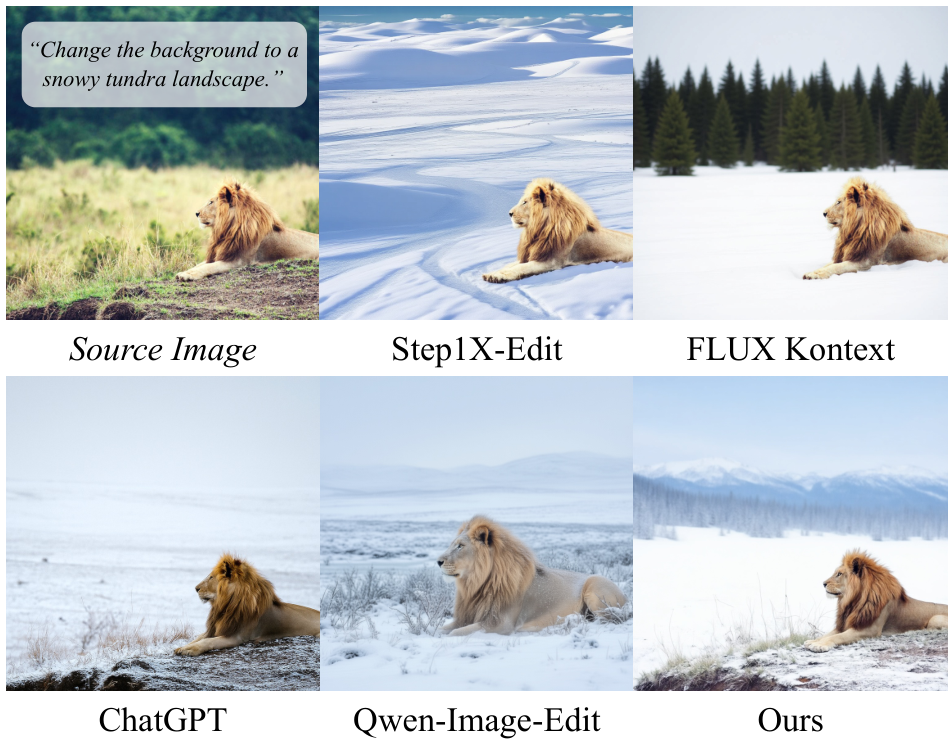在指令级图像编辑任务中,ViBT展现了极高的指令遵循能力。当用户输入将背景改为雪原景观时,模型能够精准地识别并替换背景区域,同时完美保留前景物体的每一个像素细节。