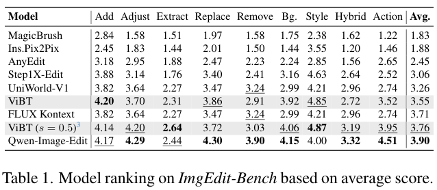 在ImgEdit-Bench(图像编辑基准)测试中,ViBT在对象添加和风格转换任务上分别拿到了4.20和4.87的高分,显著优于Magic Brush(魔法笔刷)等基线模型。