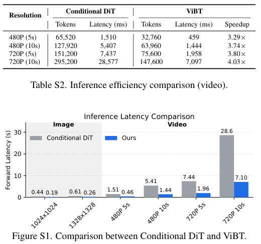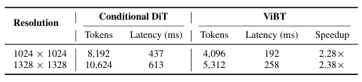 ViBT直接在潜在空间操作,不需要额外的条件Token。