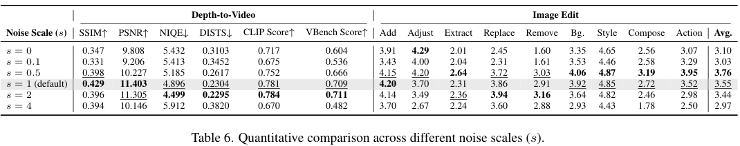 在深度图转视频任务中,表现最好的噪声尺度是2。在图像编辑任务中,最佳值是0.5。