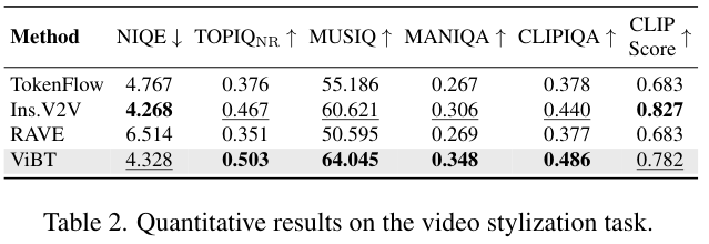 定量数据显示,ViBT在NIQE(自然图像质量评估器)指标上达到了4.328,优于TokenFlow(令牌流)等竞争对手。这说明其生成的视频在感知质量上更符合人类的审美标准。