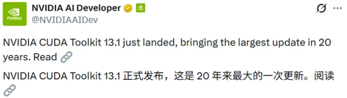 英伟达 CUDA Toolkit 13.1 发布,这是 20 年来最大的一次更新。