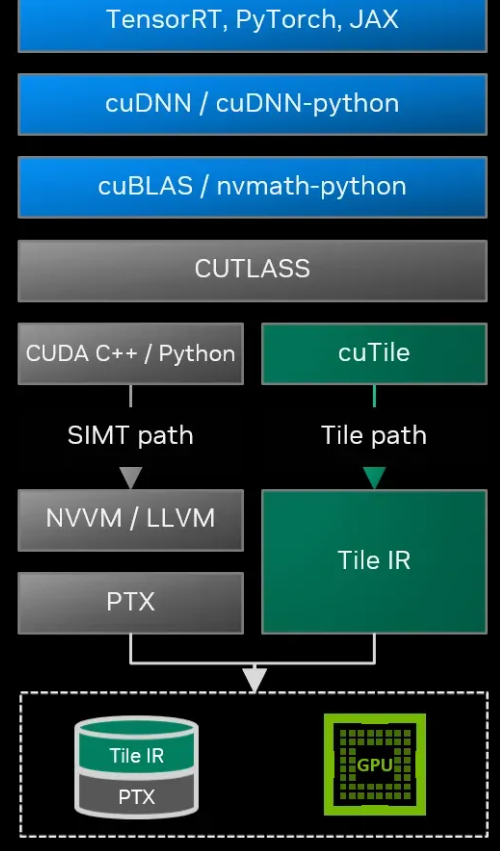 底层是 CUDA Tile IR(中间表示),这类似于 PTX 指令集,是一套专门用于描述图块操作的规范。