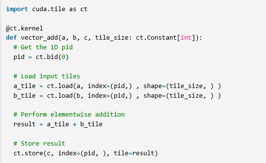 以一个向量加法为例,在传统 CUDA C++ 中,你需要计算全局线程索引,判断边界,处理每个元素。